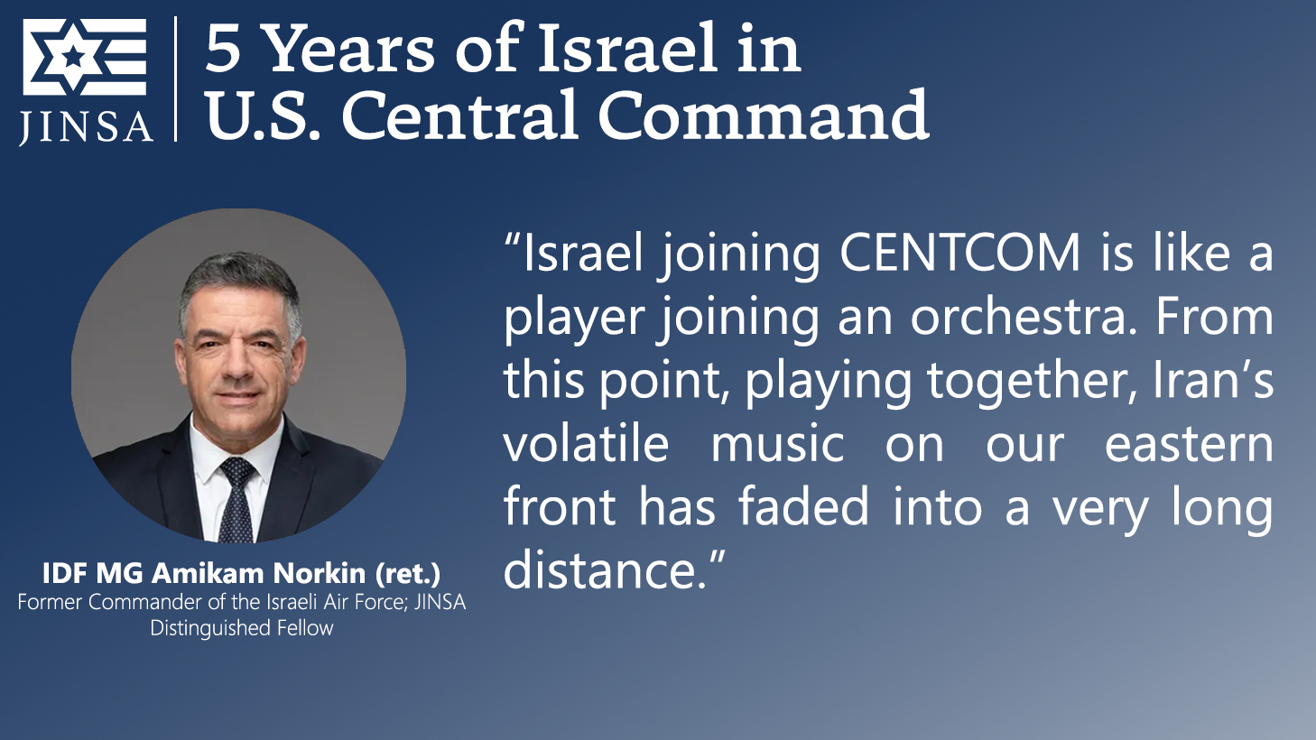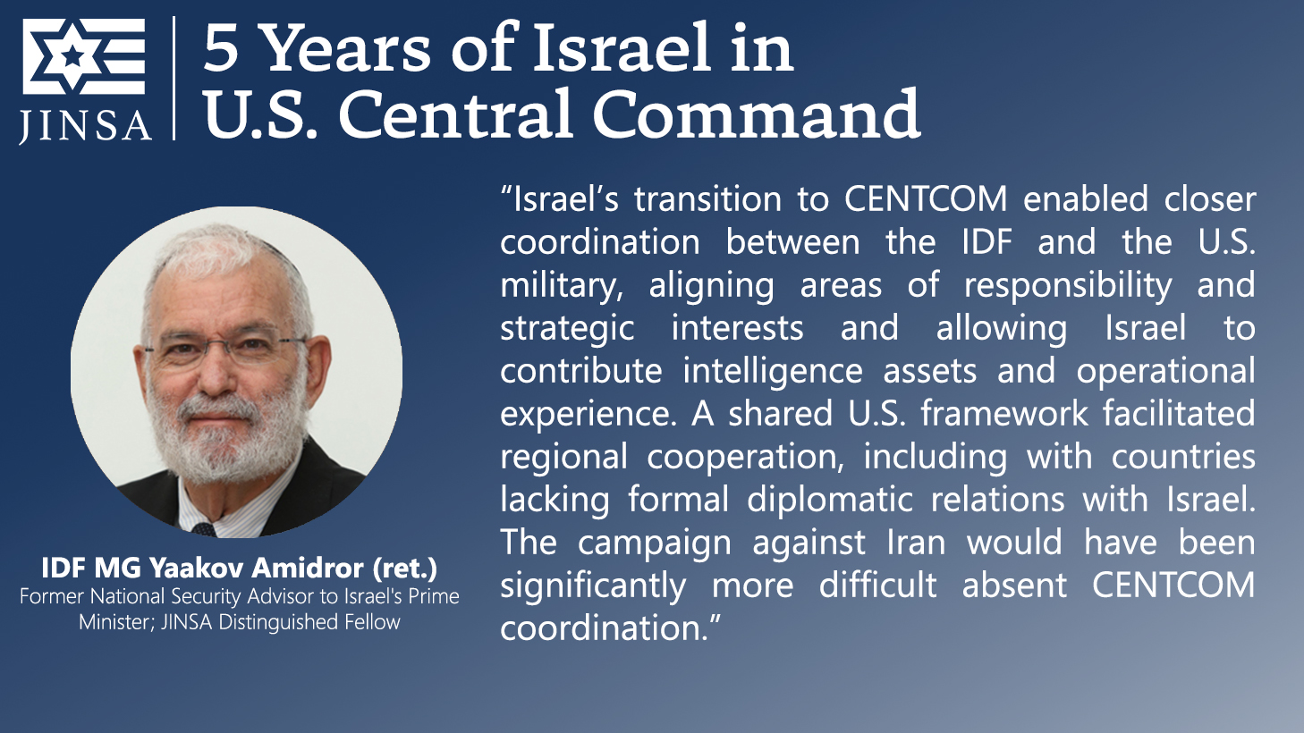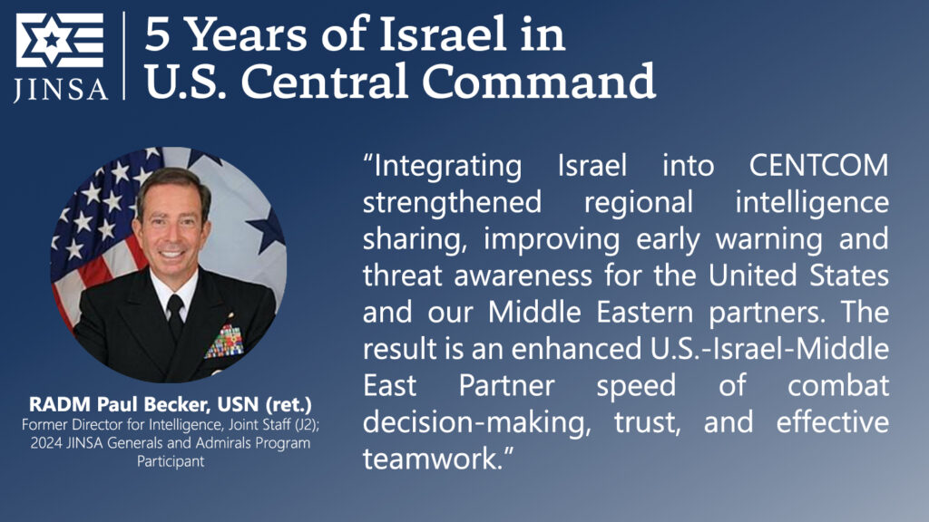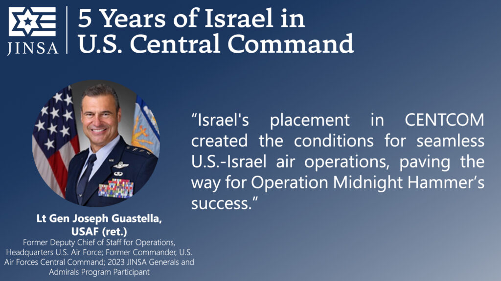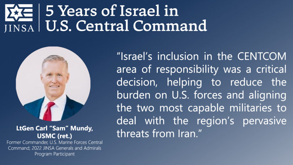 Today marks the fifth anniversary of President Donald Trump’s January 15, 2021, decision to shift Israel from the area of responsibility of U.S. European Command (EUCOM) to that of U.S. Central Command (CENTCOM), as first recommended by JINSA in 2018. JINSA then raised it more intensely in 2020, believing it should be the next step following the Abraham Accords. As the Wall Street Journal recognized at the time, immediately after President Trump’s decision, JINSA was the only organization promoting this move.