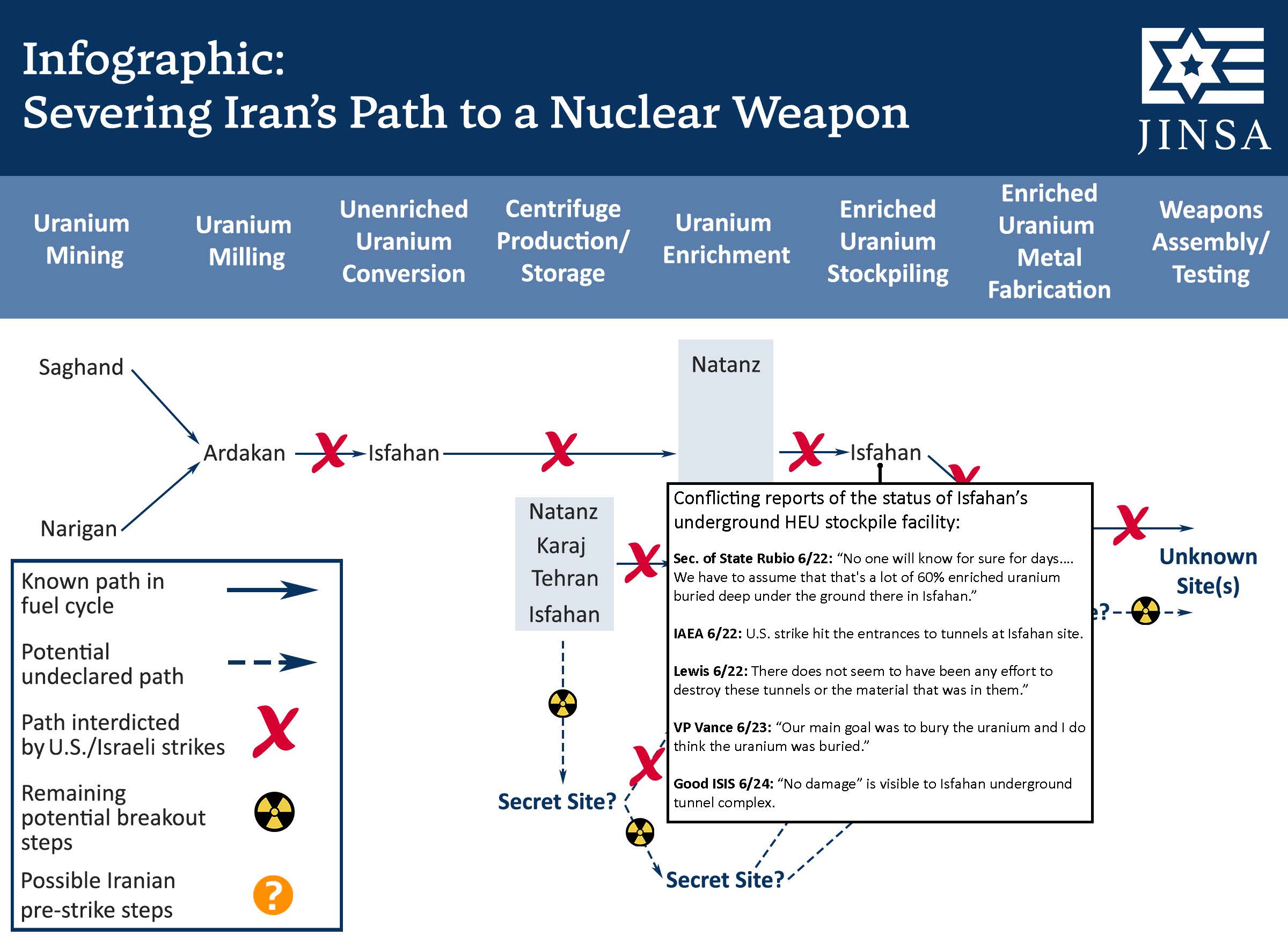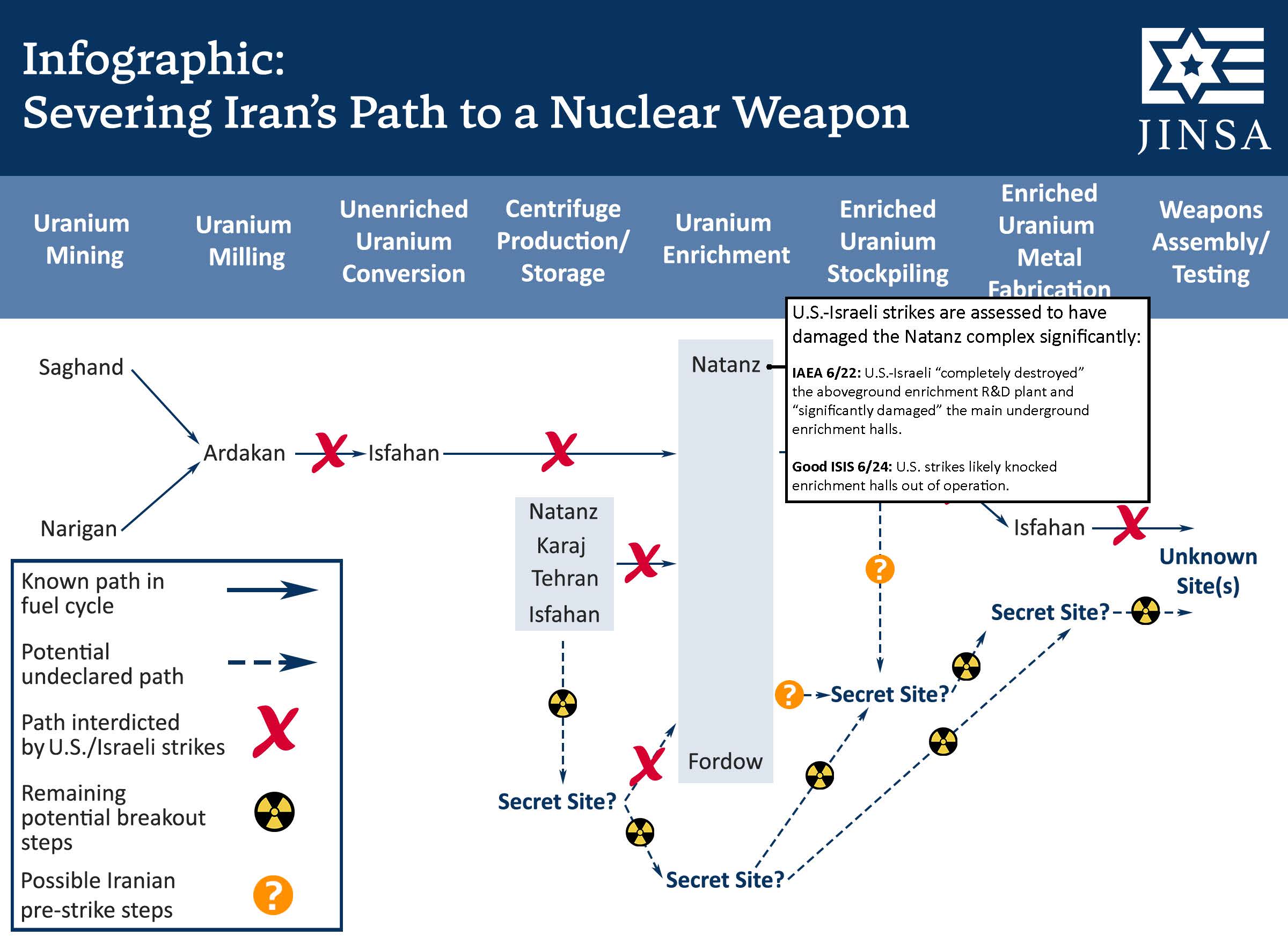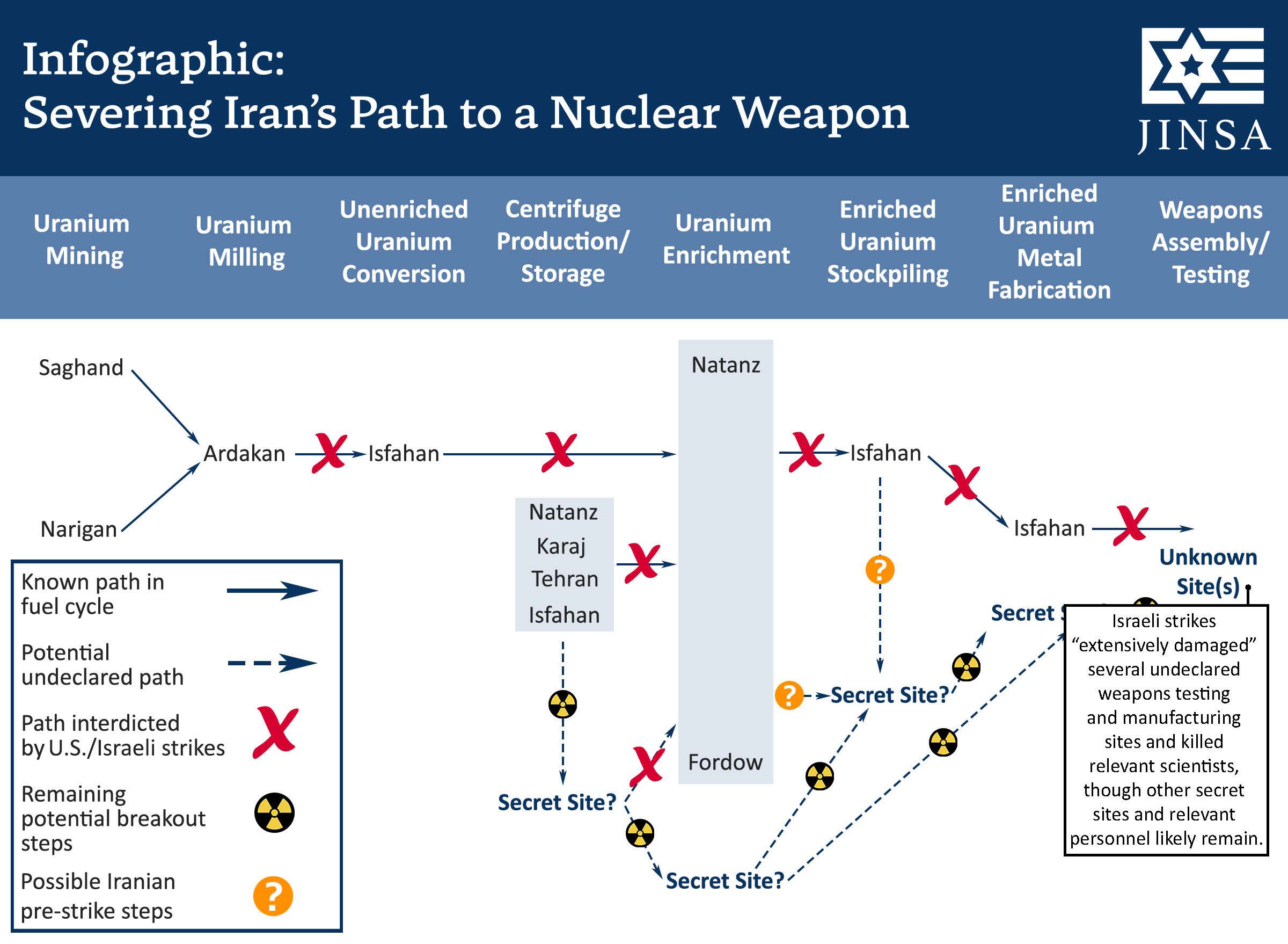 JINSA is issuing a new interactive infographic explaining the impacts of U.S.-Israeli strikes against Iran’s nuclear weapons program, and illustrating Iran’s potential covert pathways to a bomb that may have survived the recent conflict.