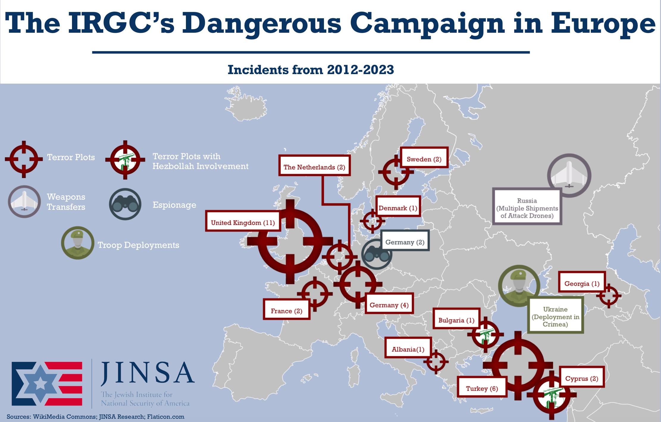 The European Union has not yet labelled Iran’s Islamic Revolutionary Guard Corps (IRGC) as a terrorist organization—despite it being involved in numerous terrorist attacks and plots on European territory. According to a new JINSA infographic, the IRGC has conducted 33 terrorist attacks in Europe since 2012 and been caught conducting espionage on several occasions. Recently, the IRGC has transferred drones to Russia and deployed military officials to help Moscow conduct its illegal invasion of Ukraine. It is time for the EU to recognize what the United States already has: the IRGC is a terrorist organization.