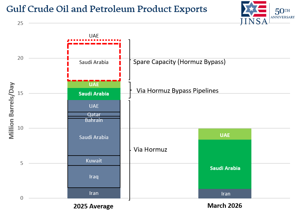 Alternative outlets like Saudi Arabia’s East-West Pipeline to the Red Sea and the Emirati (UAE) Habshan-Fujairah Pipeline to the Gulf of Oman can redirect no more than one-third of these disrupted oil supplies, and none of the LNG (see chart and map). Moreover, Iran has struck export facilities and tankers near Fujairah repeatedly, and Tehran’s Houthi proxy in Yemen has shown real capability to disrupt shipping along the Red Sea—including the East-West Pipeline’s terminal at Yanbu and other Saudi energy hubs. With their storage tanks full and no ships taking on new supplies, Arab Gulf countries have scaled back oil production by at least 10 million bbl/d, and the world’s second-largest LNG exporter, Qatar, has halted such output altogether. The global oil market’s normal ability to absorb much of this shock is negated by the fact that most crude oil spare production capacity is now stranded in Saudi Arabia and the UAE.