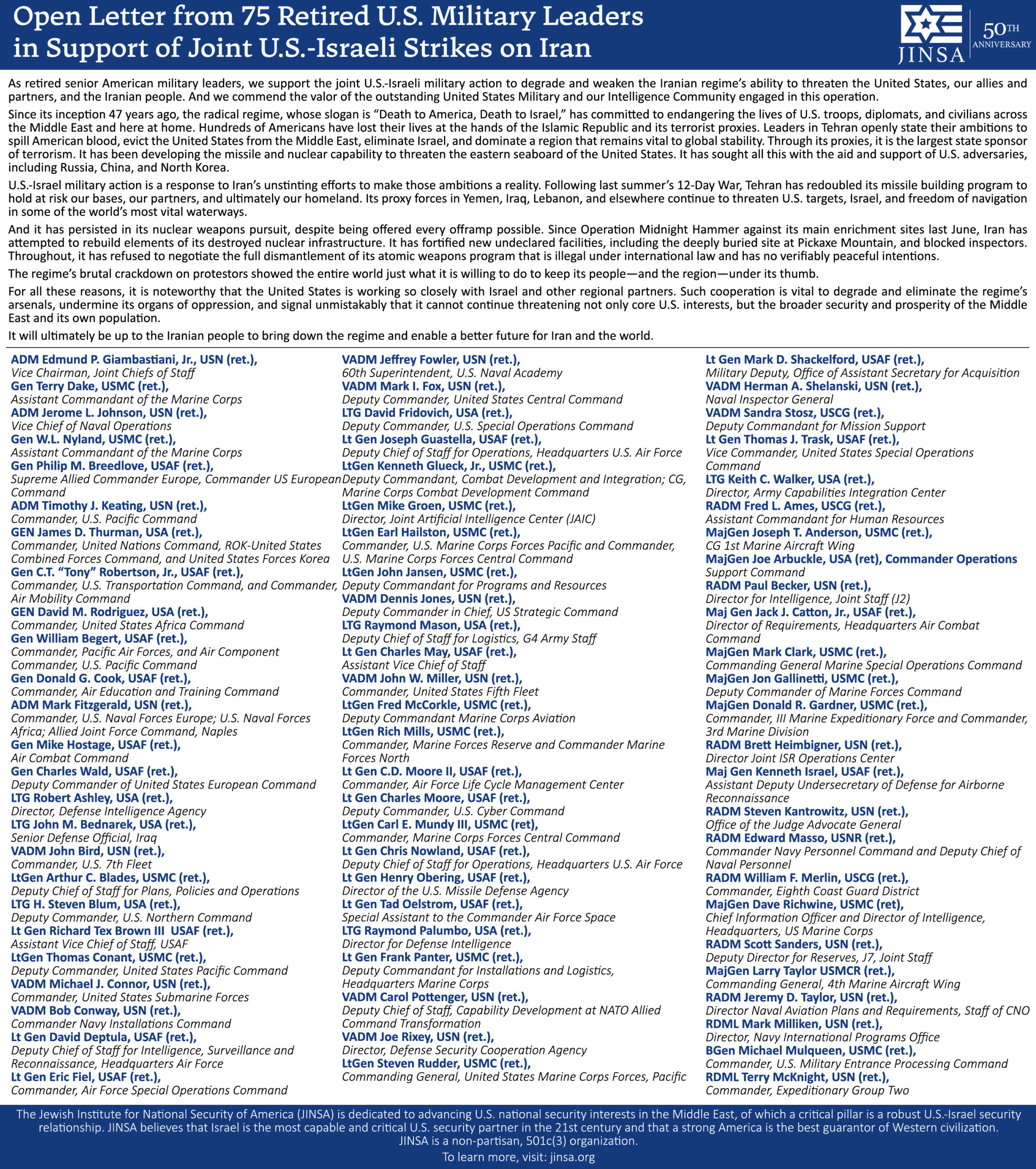 JINSA issued the following letter, signed by 75 retired U.S. generals and admirals, in support of Operations Epic Fury and Roaring Lion against the Iranian regime: